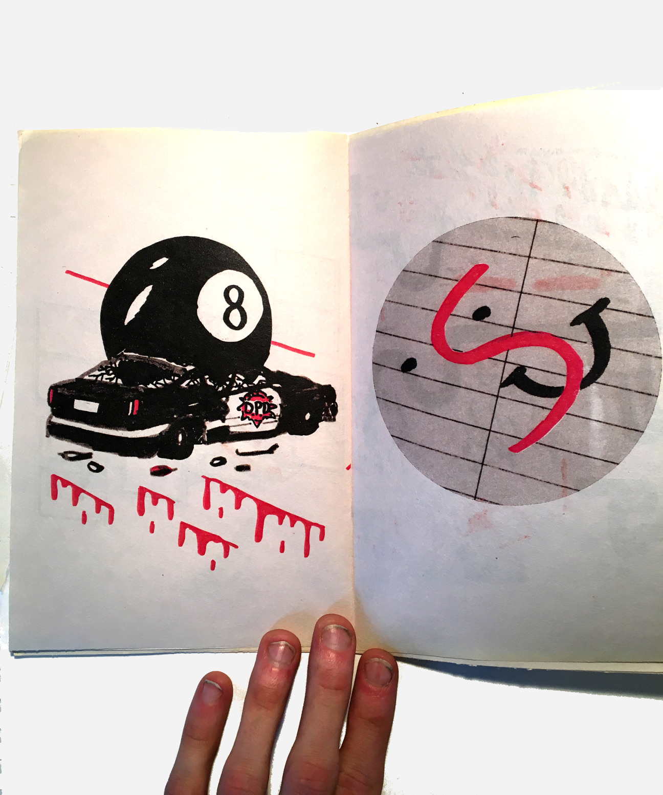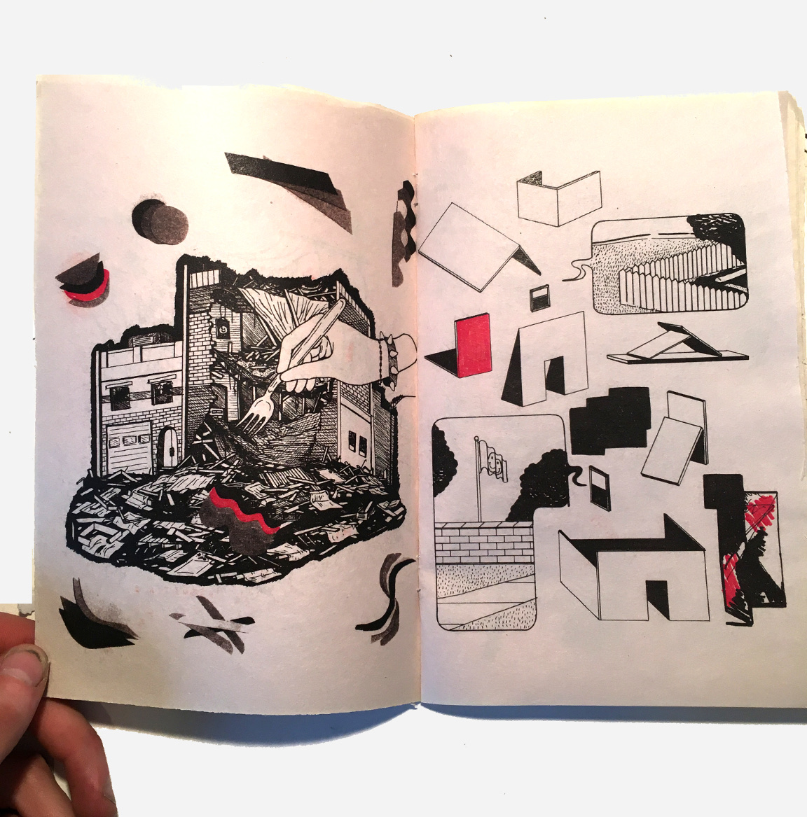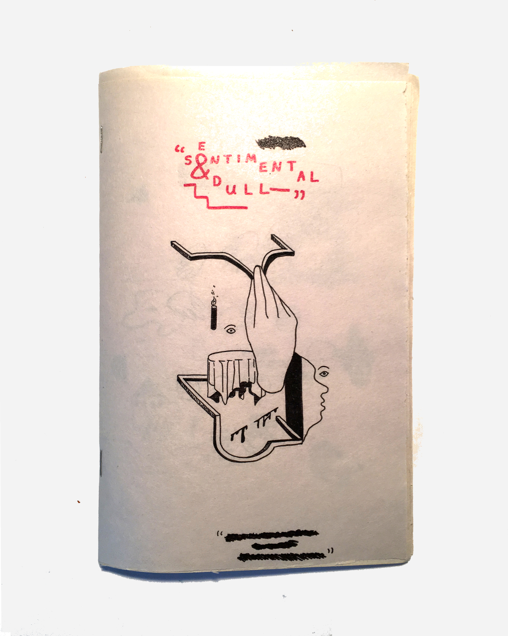 A bunch of old drawings on newsprint stapled together. Some drawings never used before some used a bunch. It is in red and black and hey I think it looks pretty cool? Put it in your bathroom or something!